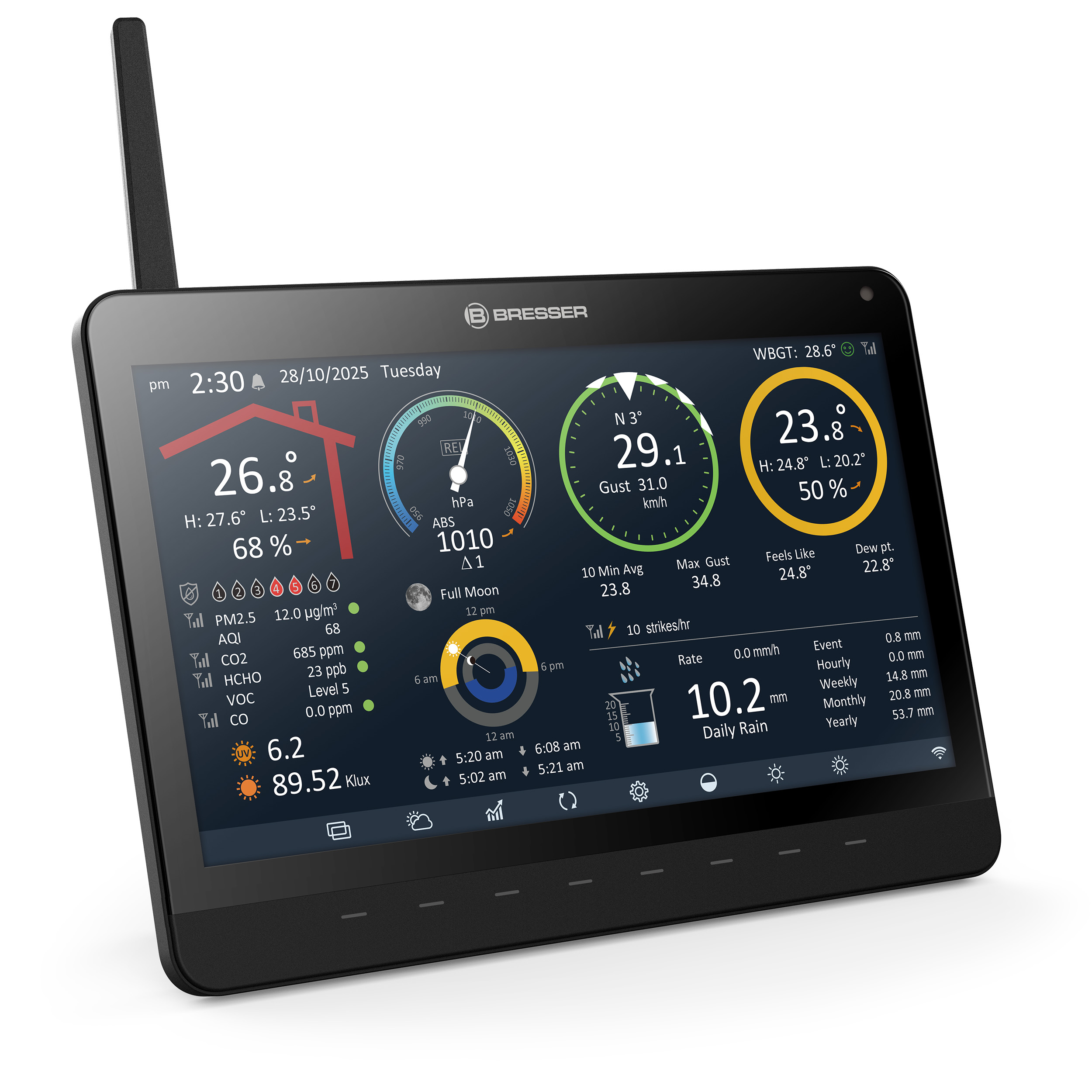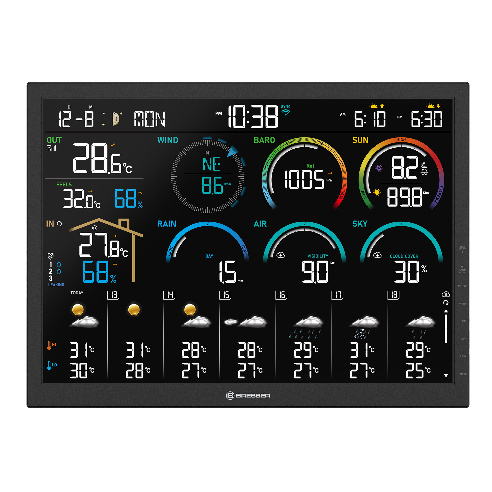 Fylgstu með veðrinu með BRESSER 7-í-1 sólar 6-daga 4CAST PRO Wi-Fi veðurstöðinni. Veðurstöðin er með stílhreinan litaskjá og sýnir áreiðanlega 6 daga veðurspá. Gögn fyrir veðurspána eru flutt frá ProWeatherLive pallinum til sólarknúnu Wi-Fi veðurstöðvarinnar og birt sem grafískt tákn. Skjárinn sýnir einnig staðbundið skyggni og skýjahulu frá ProWeatherLive netþjóninum.